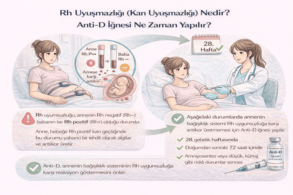 Rh uyuşmazlığı nedir, Anti‑D iğnesi hangi haftada yapılır? 28. hafta ve doğum sonrası 72 saat kuralı, kanama/işlem sonrası Anti‑D gerekliliği.